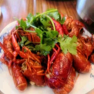 炸好后,锅中油倒出留少许即可,放入蒜头、姜、花椒、八角炒香,倒入炸好的小龙虾中火炒,放入料酒、啤酒(漫过小龙虾)、耗油、盐、生抽、醋,鸡精中火闷大概15~20分钟,多切好些蒜蓉,待入味后再放入蒜蓉,煮1分钟起锅,放上香菜完成,开吃