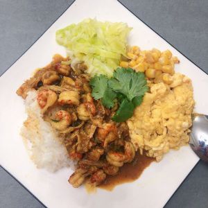锅内放油加入姜葱炒出香味后倒入小龙虾肉翻炒,然后放入泰式咖喱料包翻炒片刻后加入水,烧开后小火8分钟,因为我这里的龙虾肉已经熟了所以不需要很长时间,然后倒入椰浆料包大火再次煮沸后装盘