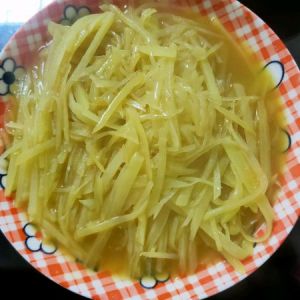 翻炒后加入盐、鲜酱油和醋,稍微翻炒后加入水继续焖煮一会就可以出锅了。(煮个大概一分钟左右)