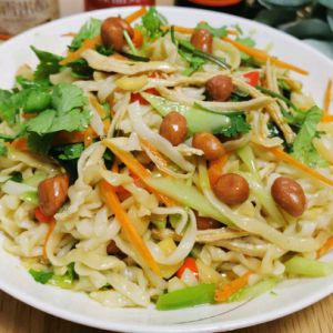 把面条,黄瓜,红萝卜放入调料中拌匀 再加入香菜和花生,酸辣美味的鸡丝凉面就完成了。