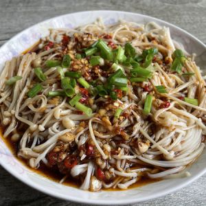 金针菇洗净,焯水(熟了即可),捞出放凉,装盘备用。