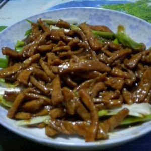 瘦肉切条,用酱油,料酒,植物油腌制十分钟
