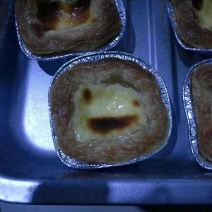 然后装进蛋挞皮里,装八分就可以,蛋挞皮有点化了,所以皮都不好了,用了16个蛋挞皮,最后蛋液有些不够,烤箱我提前预热了15分钟220