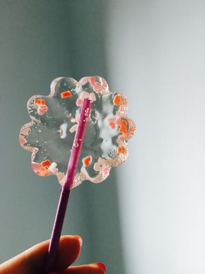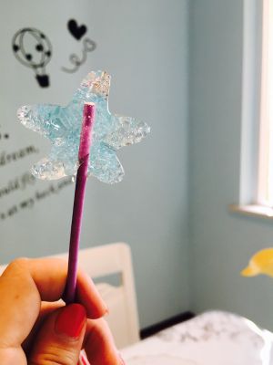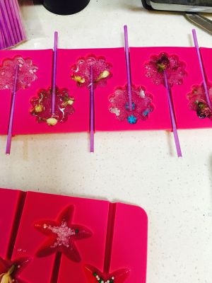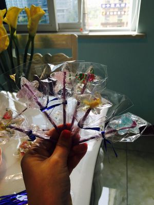 先把装饰物和花朵,放在模具里面,然后再倒入化开的糖水,等糖稍微冷一点在放人糖棒
