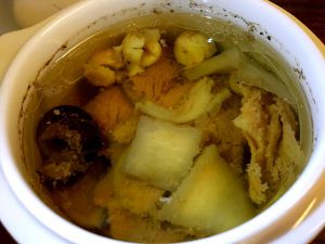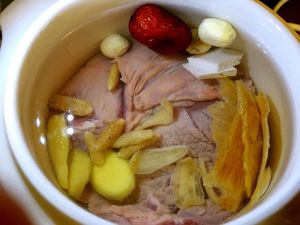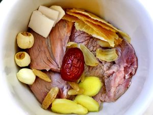 肉洗净,开水烫掉肉沫,姜与肉入炖盅冷水
