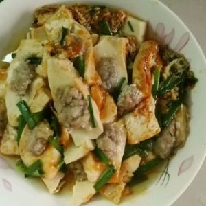 放锅里,盖好锅盖。中火,匀速缓慢旋转炒锅。大概是局部一个地方加热到冒热气,再旋转到另一个地方。再准备好勾芡(酱油,生粉,水)倒入,继续中火把锅旋转一周。撒上葱花。焖一会就ok了。全程不要用锅铲翻豆腐。会散的。