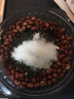 炒好的苔条加入冷却后的花生仁,最后洒上白糖拌匀
