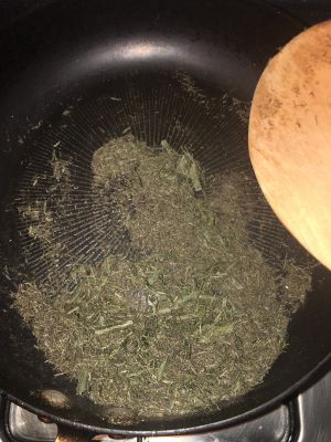 苔条先用剪刀剪成小段,然后撕碎,锅热后,不放油干炒