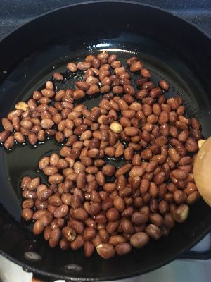 锅内倒油,倒入干花生仁翻炒,注意火不要太大。中火,要不停的翻炒。炒熟后撩出