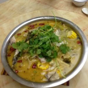将鱼头鱼尾等制汤材料倒入锅中熬煮出香味,把时令蔬菜烫熟一一放入,我放的有(菜花,玉米,芋头切块,酸菜,金针菇,腐竹片或腐竹条),试下味,适量加调料,将腌制鱼片倒入锅中,旺火烫至变色断生,起锅,连汤带鱼片倒入保温砂锅内。将炸香的花椒粒、干红椒段铺在鱼片上,撒上切段的葱花,香菜,烧滚1大勺油浇淋上。