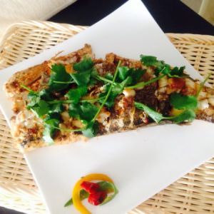 腌制好的鱼皮上摸少许白糖,撒上辣椒粉