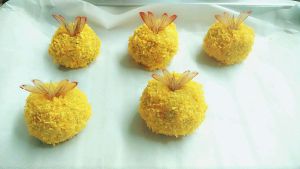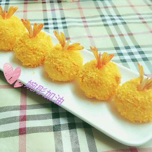把虾球在淀粉中滚一圈,然后在蛋液中滚一圈,再在面包糠中滚一圈,放到铺好硅胶油纸的烤盘上,插上虾尾。