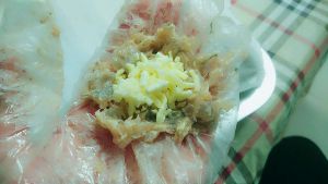 把虾泥摊平,中间放适量马苏里拉芝士,再包起来团成球。同时准备3个小碗,分别放淀粉、蛋液、面包糠。