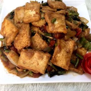 豆腐切长方形快,大约后2、宽4、长5厘米,并用冷水泡10分钟左右,为的是去豆腥及炒制时不容易破