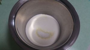 接下来我们来打发淡奶油。将淡奶油和细砂糖放到小盆里。