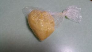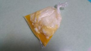接下来,双手拿起袋子,一只手抓住袋子底部,另一只手抓住袋子口。上下左右摇晃袋子,直到袋里的混合物形成团状。