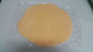 将面团从冰箱里取出,在其表面铺一张与底下相同大小的保鲜膜。