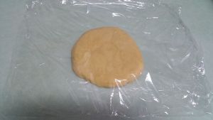 裁一张30cm大小的保鲜膜,将混合好的面团放在保鲜膜上。