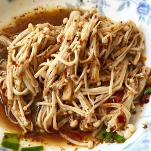 把香葱切成小段,将辣椒面、花椒面、葱段、盐、醋、生抽、香油倒入金针菇里。