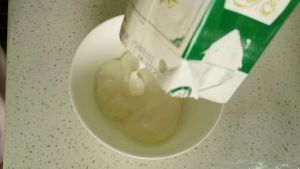 按菌粉比例,将菌粉加入牛奶中,充分搅拌5分钟(搅拌充分很重要)