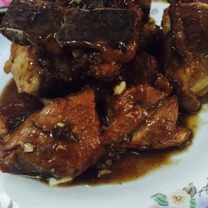 排骨熟后大火收汁。。其实全程大火就可以,先加盖住十五分钟,然后就不加盖煮,耗干水分,收汁,收汁以后你就会发现,颜色很好看,完全不需要加老抽,可以加点蒜末,蒜香风味。。。最后这张图是我的排骨,我喜欢这种肉多的腔骨,毕竟是为了吃肉,精排肉太少