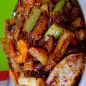 抱歉忘拍照片 热锅热油 将辅料下锅爆香 然后加两三勺老干妈 一勺豆瓣酱 接着一次下入已过油的食材翻炒至均匀沾料