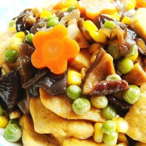 起锅,放葱,炒出香味后,将(香菇豌豆玉米胡萝卜)和木耳入锅煸炒一下,然后再放入豆腐片。
