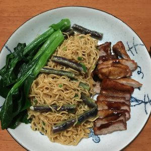放凉后,切成小片,将锅里的酱汁淋在叉烧上。然后煮一碗面条,豆角掐成小段烫熟,青菜烫熟。