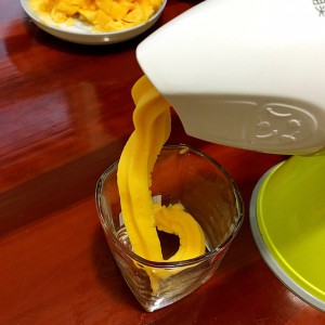冷冻后的芒果解冻5分钟左右,用果语原汁机冰淇淋头摇