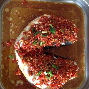 鱼头洗净放入盘中,铺上剁椒,把姜片放在鱼头旁,水开后蒸10分钟左右(根据鱼头大小,小一点的7、8分钟就行)