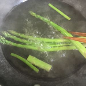 芦笋焯水,捞出马上泡凉水中,保持翠绿的颜色