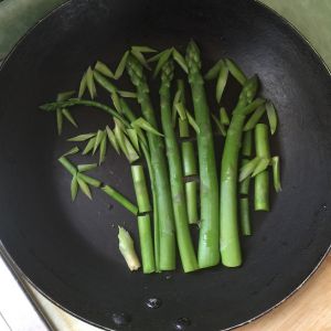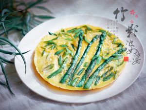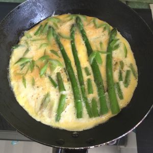 锅放火上中火煎一会儿芦笋后缓缓倒入蛋液,小火加热,在蛋液还没凝固的时候可以略调整芦笋位置,图形满意即可盖锅盖焖3分钟,全程最小火
