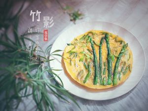 锅中刷一层植物油,芦笋摆入锅中,摆出竹子的形状,竹叶是用芦笋杆切出来的,表面撒匀黑胡椒粉少许,