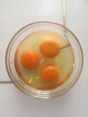 我用的鸡蛋是绿壳蛋,比较小,所以用了三颗,大一些的鸡蛋用2颗就可以了,鸡蛋加盐和少许清水打散,加入面粉混合均匀