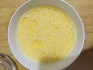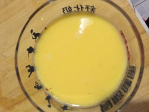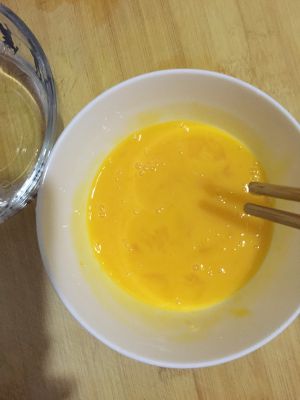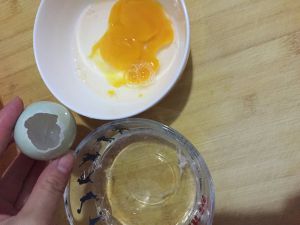 鸭蛋一个从一端打开一个小口到入碗内,另一只碗中盛入两个鸭蛋量的温水