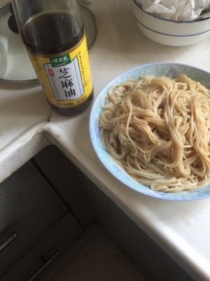 放入麻油,将葱放在面上。完成