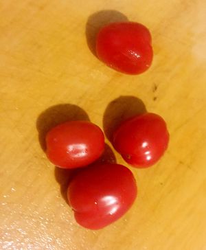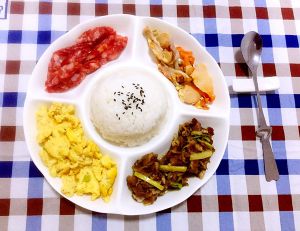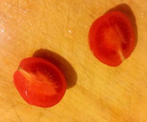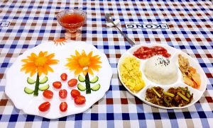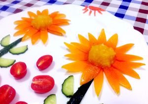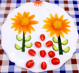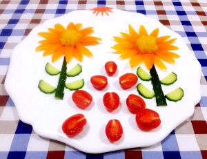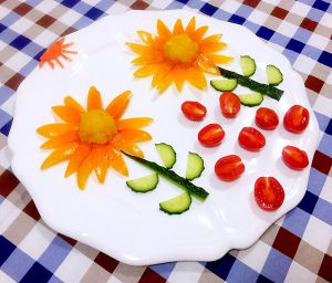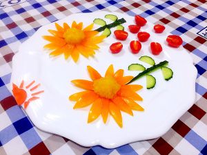 将黄瓜摆成树叶形状,圣女果摆成喜欢的形状,胡萝卜是暖暖的小太阳摆入盘中,融化的冰糖水淋在果肉泥上即可