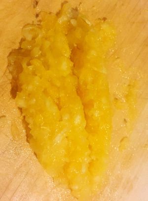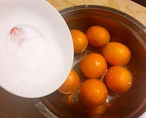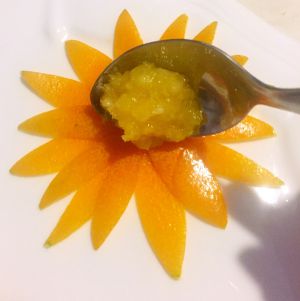 果泥用勺子整理好摆放在金桔皮中间做花蕊