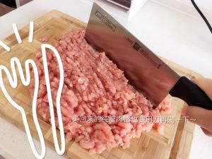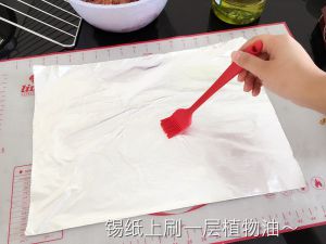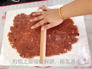 将肉馅放在锡纸上,保鲜膜盖之,擀平肉馅,薄薄的一层