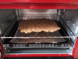 将肉片脱离锡纸,并翻面,刷蜂蜜水,撒白芝麻,烤箱220度,30分钟,烤到肉饼颜色偏红为止