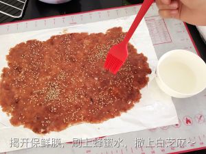 揭开保鲜膜,刷蜂蜜水,撒上白芝麻