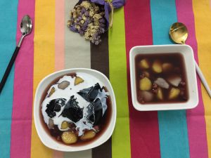 将事先煮好的红豆汤从冰箱取出,加入芋圆、龟苓膏和炼乳。