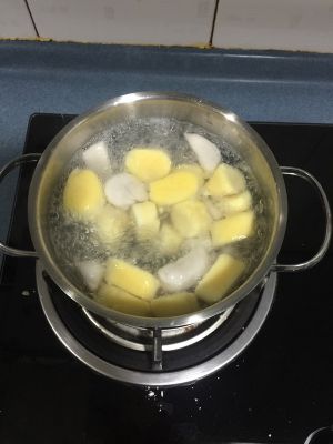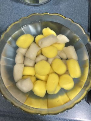 捞起放入凉开水中浸泡,需换两次凉水,再捞起备用,芋圆很Q弹