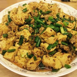 放一点油,加入沥干的豆腐块翻炒,加肉糜,加郫县豆瓣酱,因为豆瓣酱会咸,可以少放盐,翻炒一小会入葱花