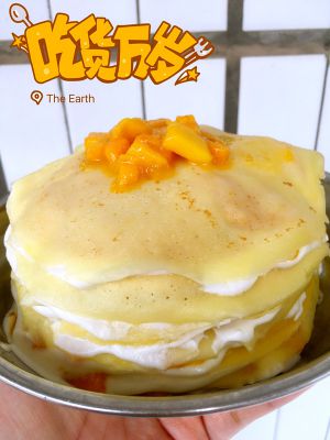 再放上一张饼皮抹上奶油放上芒果,重复几次这个步骤。