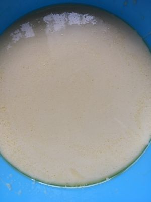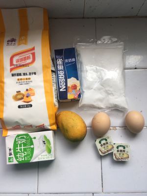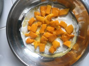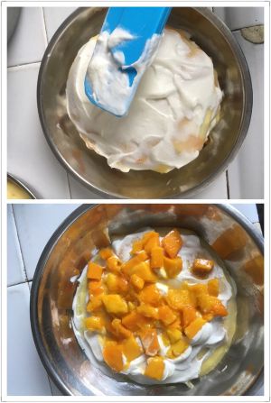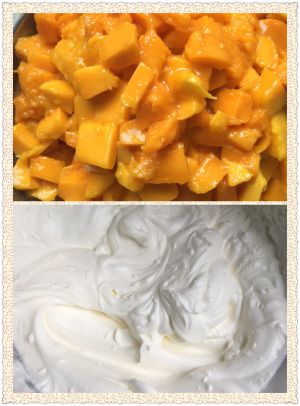 等待面糊的过程中把芒果切成你喜欢的大小顺便把奶油打发了。