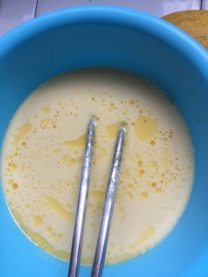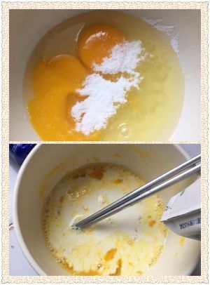 鸡蛋打到碗里。加糖粉,加牛奶。