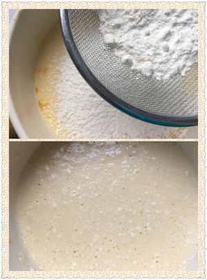 筛入低筋面粉,搅拌均匀成面糊,有面疙瘩也没关系,要过筛的。