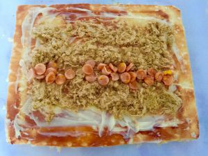 将面饼周围进行修整,整成平整的长方形,接下来就是包寿司环节了。先涂上沙拉酱,再上放上肉松和火腿肠。