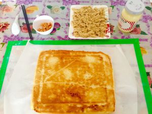 准备张油纸垫在下面,将面饼倒扣在油纸上。